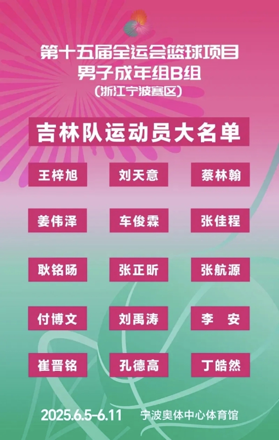 5月30日,中国吉林网从相关渠道获悉,十五运成年组男篮吉林队大名单确定:姜伟泽、崔晋铭领衔,丁皓然、李安、孔德高、刘天意等多位现役CBA球员在列。