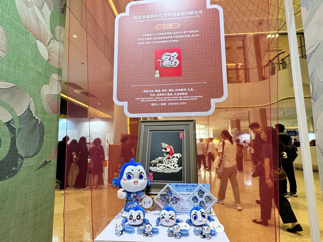 现场展示“冰湖腾鱼”鱼皮画、独特可爱的ip查小鱼及一系列衍生文创产品,带大家感受渔猎文化加现代美学的成功转化。