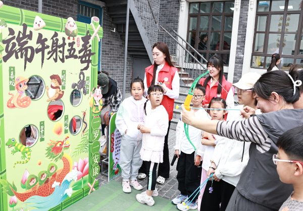 射五毒祈平安游戏、民俗投壶游,端午诗词互动秀吸引孩子们参与其中。群众手绘五彩蛋,手工制作艾草花束、香包和中药香囊戴在身上,承载着传统节日赋予的美好寓意。