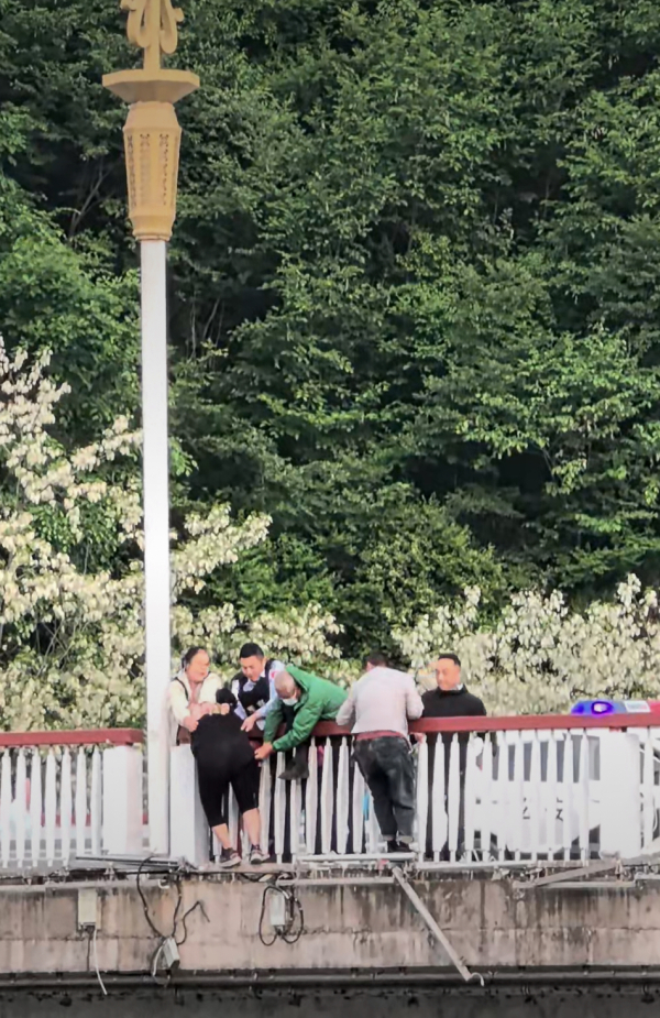 警车在5时21分急刹在桥头,丁于和同事华倚天跳下车,看见桥栏外侧站着位年近7旬老人,旁边一位中年女子正拽着老人的手,声音发颤:“大姐,有啥事咱下去说!”后来才知道,这名女子与老人素不相识,只是路过时看见她神色异样,便停下劝阻。