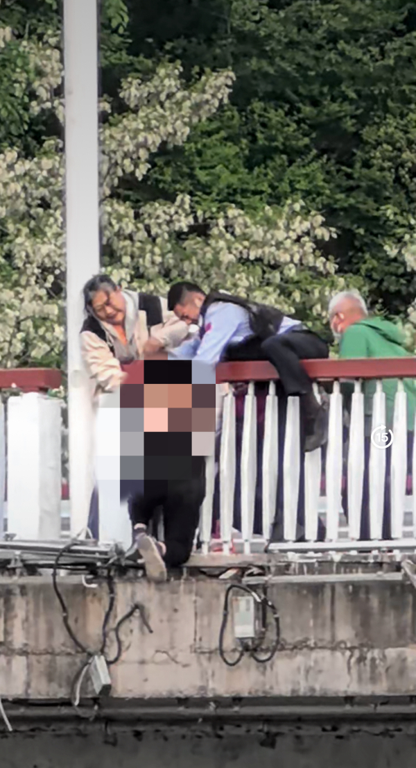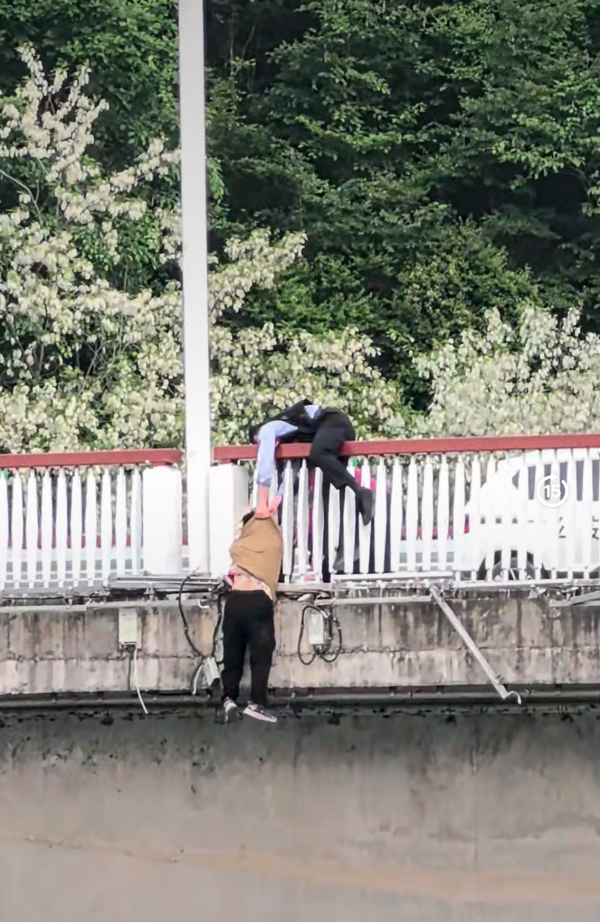 “你们别管我!”这位情绪激动的老人正做着下蹲状,试图纵身一跃,民警华倚天一个箭步冲过去,透过护栏空隙,紧紧抓住老人手腕,与此同时,民警丁于迅速跨上桥栏,准备将老人拉回安全地带。然而,老人并不配合,“她双腿一蹬,整个人突然悬空了。”危急之时,民警丁于一手紧抠护栏,干脆骑在桥上,身体一侧翻出桥外,此时,老人的体重几乎全压在了华倚天、丁于和中年女子紧握的手上,每一秒都可能坠落。