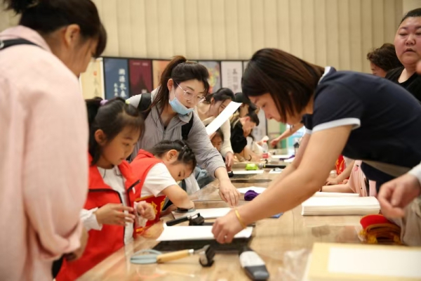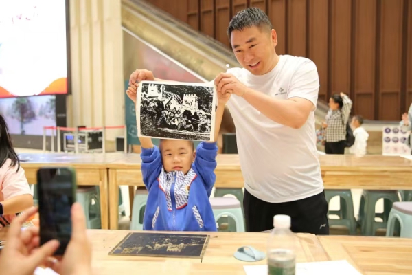 活动吸引了不少参观者来到现场,其中大部分都是父母带着孩子来参加。他们首先参观了“永远的战士——彦涵抗战版画作品展”,了解彦涵生平经历与作品内涵。然后以“永远的战士——彦涵抗战版画作品展”为模版,开展抗战题材版画拓印,重温烽火岁月,汲取奋进力量。