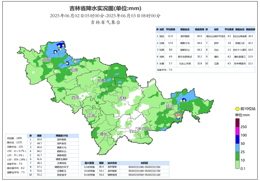 降水量前10位:龙井智新65.0毫米、龙井金谷64.7毫米、镇赉大屯64.4毫米、前郭长山64.2毫米、镇赉棉西61.7毫米、镇赉五棵树61.6毫米、汪清鸡冠60.1毫米、镇赉四方坨子57.1毫米、汪清新立55.6毫米、乾安宙字55.2毫米。