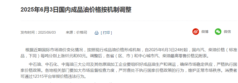 6月3日,国家发改委消息显示,根据近期国际市场油价变化情况,按照现行成品油价格形成机制,自2025年6月3日24时起,国内汽、柴油价格每吨分别上涨65元和60元。