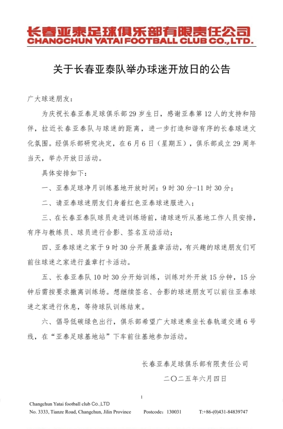 6月6日,长春亚泰足球俱乐部将迎来29岁生日。为了感谢亚泰第12人的不离不弃,俱乐部决定在生日当天举办开放日活动,邀请广大球迷和媒体朋友走进亚泰净月基地观看亚泰将士的训练。