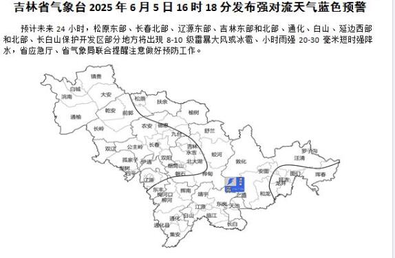 吉林省气象台2025年6月5日16时18分发布强对流天气蓝色预警:预计未来24小时,松原东部、长春北部、辽源东部、吉林东部和北部、通化、白山、延边西部和北部、长白山保护开发区部分地方将出现8-10级雷暴大风或冰雹、小时雨强20-30毫米短时强降水,省应急厅、省气象局联合提醒注意做好预防工作。