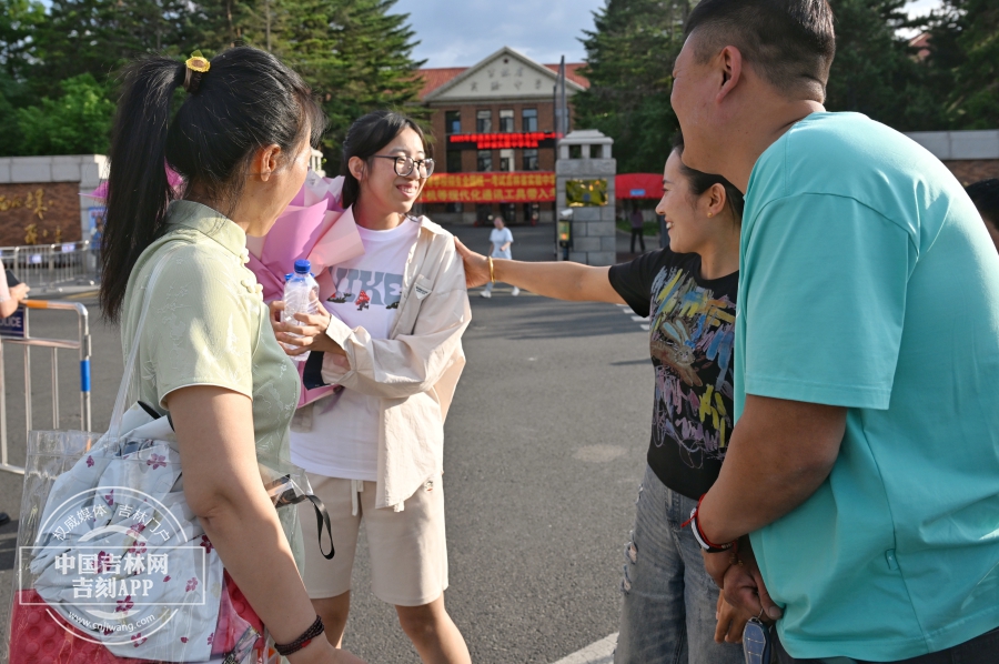 家长们有的搂着考生细语一句“辛苦了”,递上早已准备好的鲜花……无需过多言语,关切与心疼溢于言表。还有老师依然守候在出口,与学生击掌、微笑、送上简短有力的鼓励:“加油!”“明天继续!”