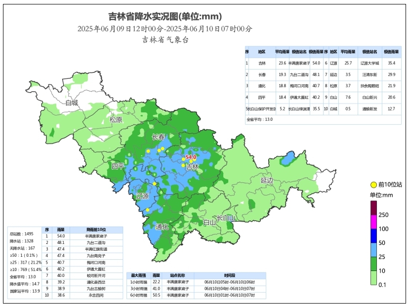 降水量前10位:丰满唐家崴子54.0毫米、九台二道沟48.1毫米、丰满红旗街道47.4毫米、九台南岗子47.4毫米、梅河口河南40.7毫米、伊通大酱缸40.2毫米、蛟河新开河40.0毫米、通化县西岔39.2毫米、九台古榆树38.9毫米、永吉四间38.6毫米。