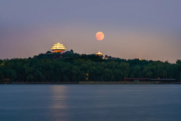2024年6月21日,“最低满月”亮相北京北海公园上空。(资料图片)