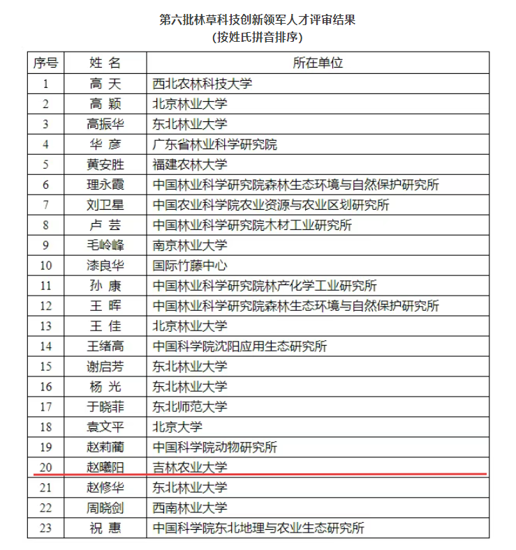 根据国家林业和草原局林草科技创新人才和团队建设工作计划,经国家林业和草原局评审,近日,吉林农业大学林学与草学学院赵曦阳教授入选第六批林草科技创新领军人才,全国共计遴选23人。