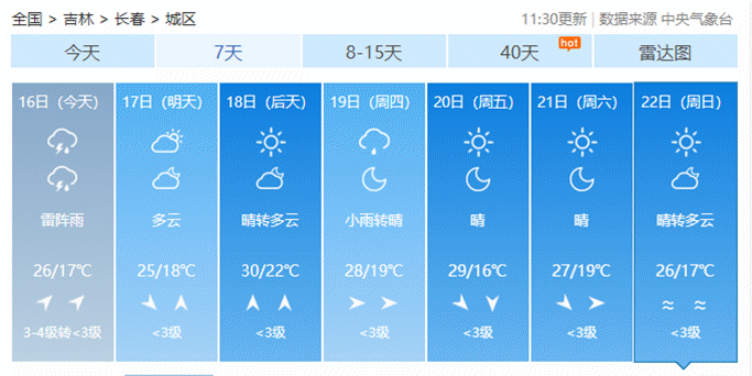 16日通化南部、白山南部、延边南部、长白山保护开发区有小到中雨,局部大雨,并伴有短时强降水、雷暴大风或冰雹等强对流天气,其他地区有阵雨或雷阵雨;