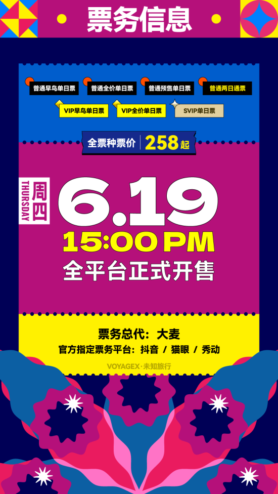 6月19日14:00开售早鸟普票,6月19日15:00全平台正式开抢!票务总代:大麦,官方指定票务平台:抖音、猫眼、秀动。那英、李健、李荣浩、老狼、胡宇桐、房东的猫、重塑雕像的权利、囍浪、deca joins、许钧、崔迪、Jake Miller(US)、简单对话乐队、step.jad依加……这个夏天在长春等你。