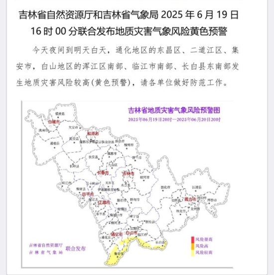 吉林省自然资源厅和吉林省气象局2025年6月19日16时00分联合发布地质灾害气象风险黄色预警:今天夜间到明天白天,通化地区的东昌区、二道江区、集安市,白山地区的浑江区南部、临江市南部、长白县东南部发生地质灾害风险较高(黄色预警),请各单位做好防范工作。