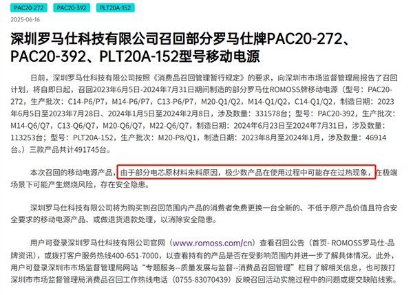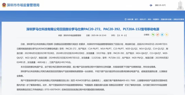 据深圳市市场监督管理局网站6月16日消息,日前,深圳罗马仕科技有限公司按照《消费品召回管理暂行规定》的要求,向深圳市市场监督管理局报告了召回计划,召回的三款产品共计491745台。将自16日起,召回2023年6月5日至2024年7月31日期间制造的部分罗马仕ROMOSS牌移动电源。