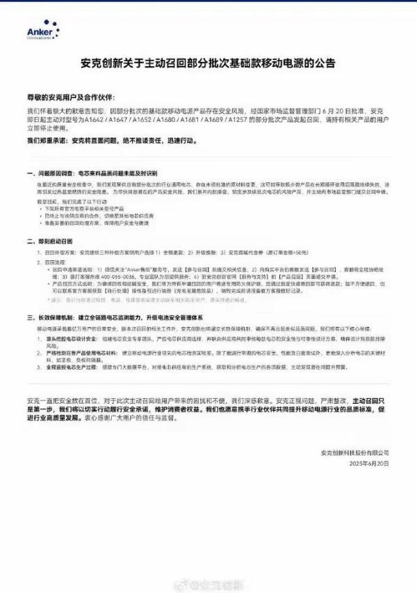 大牌企业安克创新也坐不住了。6月20日,安克自己发公告说,要召回部分型号的充电宝。这些产品型号是A1642、A1647、A1652、A1680、A1681、A1689、A1257。