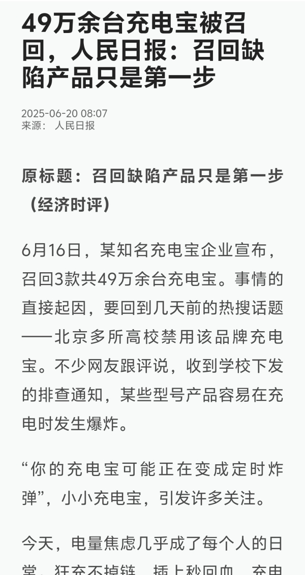 充电宝应当解决电量焦虑,而非制造安全焦虑。召回缺陷产品只是第一步,保护消费者权益、促进行业高质量发展,要做的还有很多。