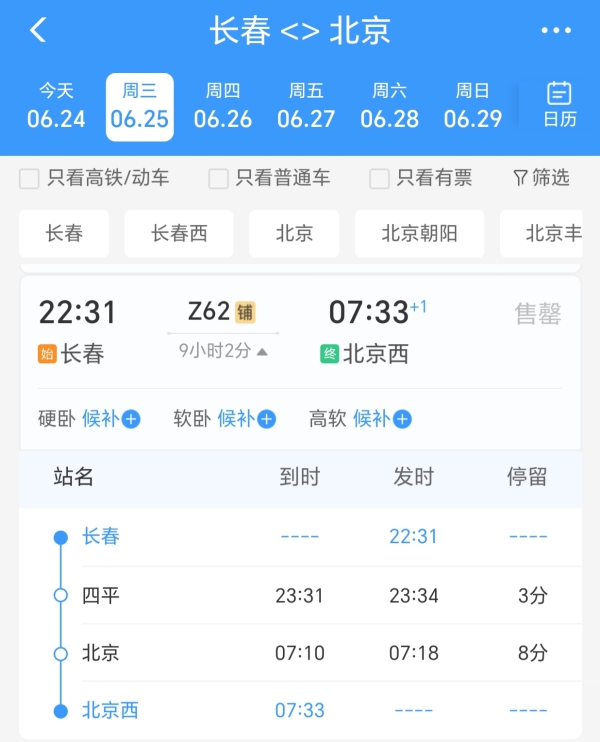 因北京站施工停运的长春至北京西Z62次列车将于6月25日正式恢复开行,Z62次列车由长春站始发途经四平站、北京站终到北京西站。