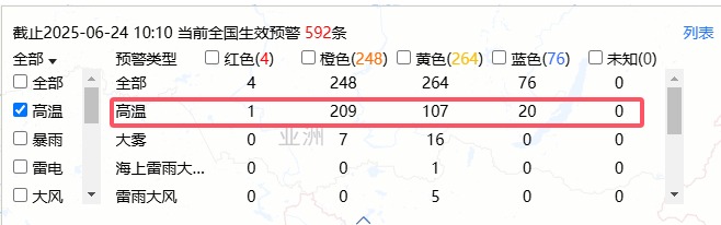 中国吉林网查询了一下,到6月24日10时,全国还在生效中的高温预警一共有337条。