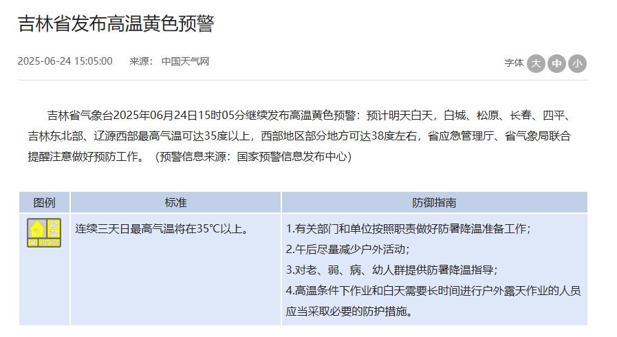 吉林省气象台2025年06月24日15时05分继续发布高温黄色预警:预计明天白天,白城、松原、长春、四平、吉林东北部、辽源西部最高气温可达35摄氏度以上,西部地区部分地方可达38摄氏度左右,省应急管理厅、省气象局联合提醒注意做好预防工作。