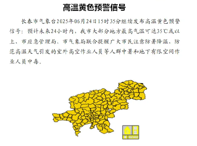 长春市气象台2025年06月24日15时35分继续发布高温黄色预警信号:预计未来24小时内,长春市大部分地方最高气温可达35℃或以上,市应急管理局、市气象局联合提醒广大市民注意防暑降温,防范高温天气引发的室外高空作业人员等人群中暑和地下有限空间作业人员中毒。