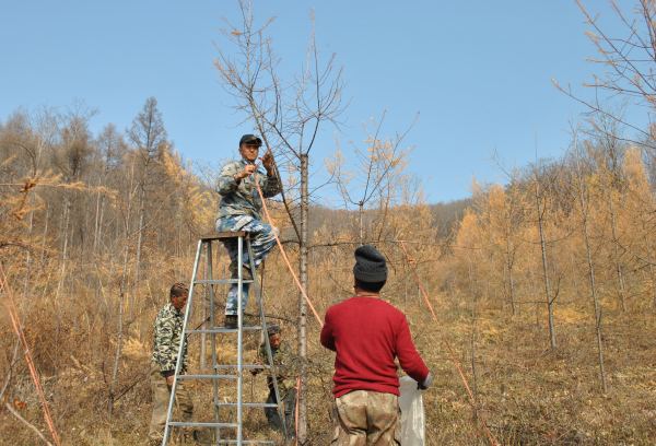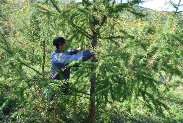 矮化处理多结实技术具体实施方式是,每年11月至3月期间,在良种基地的日本落叶松二代生产区,技术人员选择生长健壮、长势相近的日本落叶松,根据果树剪枝的原理,分别截干至2米、3米、4米和5米。选择粗壮的侧枝,用绳子向下固定,随树体变化生长阶梯式进行矮化。在夏季时,对日本落叶松进行拉枝和修剪。目前,已经对3块样地进行矮化实验,总计矮化34亩720株日本落叶松。通过实验对比,实施矮化技术的日本落叶松增加了透光性和结实量,侧枝多了,而且侧枝上结的球果也增多了,结实量平均提高了20%—30%。同时,日本落叶松矮化后高度降低,林场职工收集球果时也容易很多,节省了大量人力和时间。