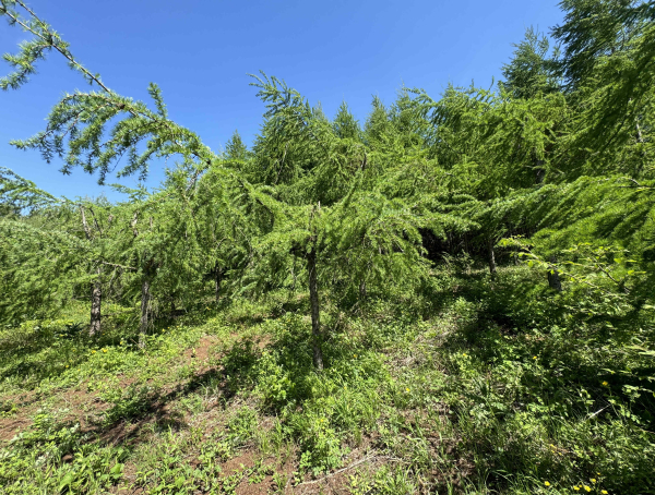 夏日炎炎,在吉林省柳河县五道沟国家日本落叶松良种基地,技术人员正在对日本落叶松进行拉枝和修剪。实施过矮化处理的日本落叶松实验林,郁郁葱葱、绿意盎然,主干被截得低矮,虬劲的侧枝被向下拉伸固定,枝条上球果点缀其间。