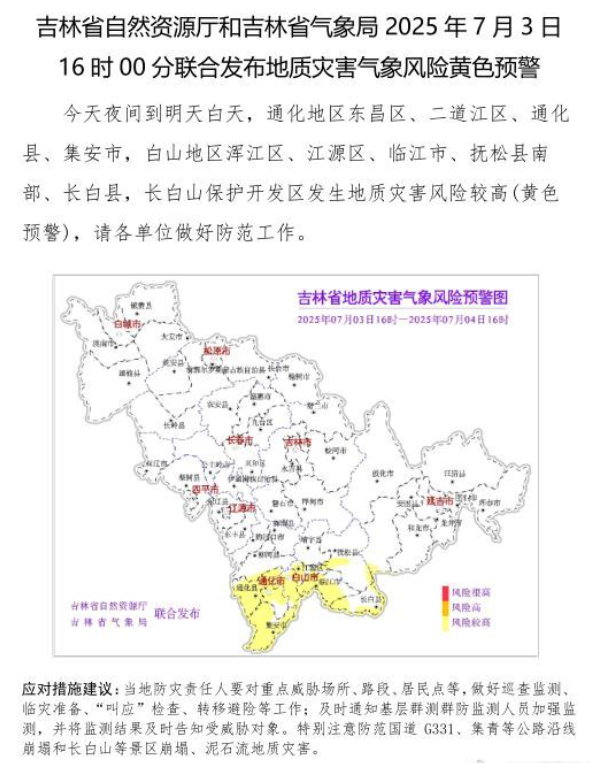 吉林省自然资源厅和吉林省气象局2025年7月3日16时00分联合发布地质灾害气象风险黄色预警:今天夜间到明天白天,通化地区东昌区、二道江区、通化县、集安市,白山地区浑江区、江源区、临江市、抚松县南部、长白县,长白山保护开发区发生地质灾害风险较高(黄色预警),请各单位做好防范工作。