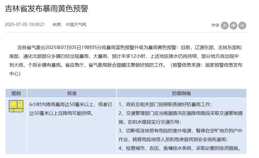 吉林省气象台2025年07月05日19时05分将暴雨蓝色预警升级为暴雨黄色预警:目前,辽源东部、吉林东部和南部、通化北部部分乡镇已经出现暴雨、大暴雨,预计未来12小时,上述地区降水仍将持续,部分地方将出现中到大雨,个别乡镇有暴雨。省应急厅、省气象局联合提醒注意做好预防工作。