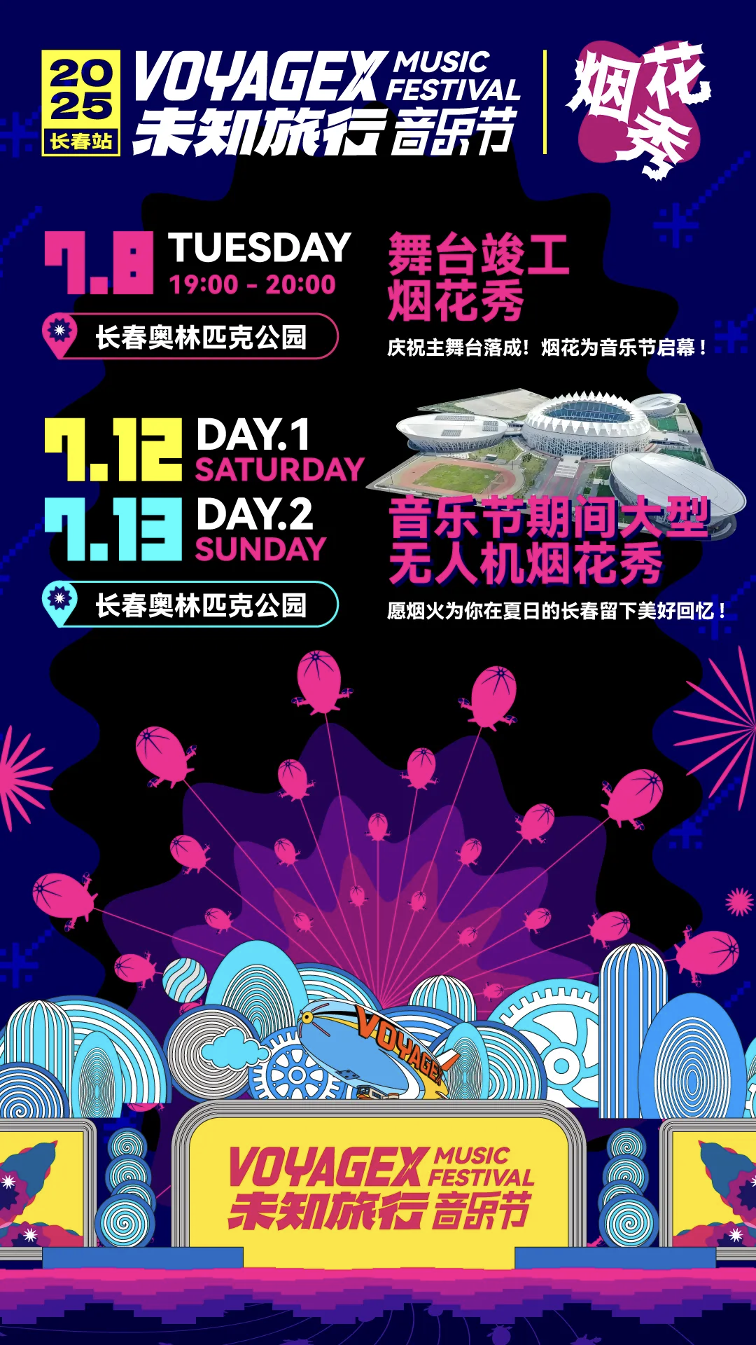7月8日19:00 奥林匹克公园“舞台焰启”竣工盛典——千发烟花为音乐节主舞台揭幕,点亮钢铁骨架,广大公众可自由前往观赏,无需门票。