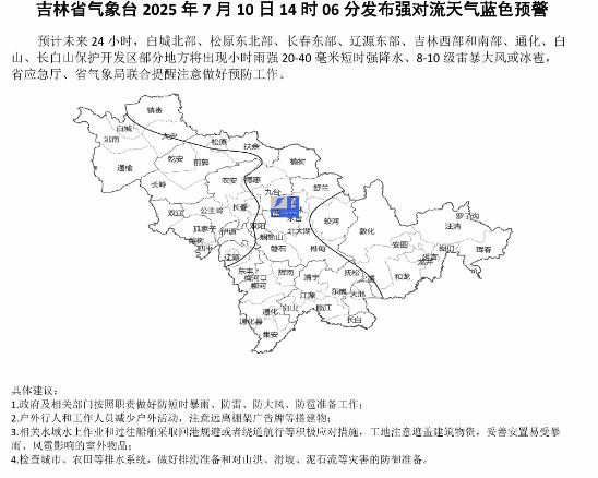 吉林省气象台2025年7月10日14时06分发布强对流天气蓝色预警:预计未来24小时,白城北部、松原东北部、长春东部、辽源东部、吉林西部和南部、通化、白山、长白山保护开发区部分地方将出现小时雨强20~40毫米短时强降水、8~10级雷暴大风或冰雹,省应急厅、省气象局联合提醒注意做好预防工作。