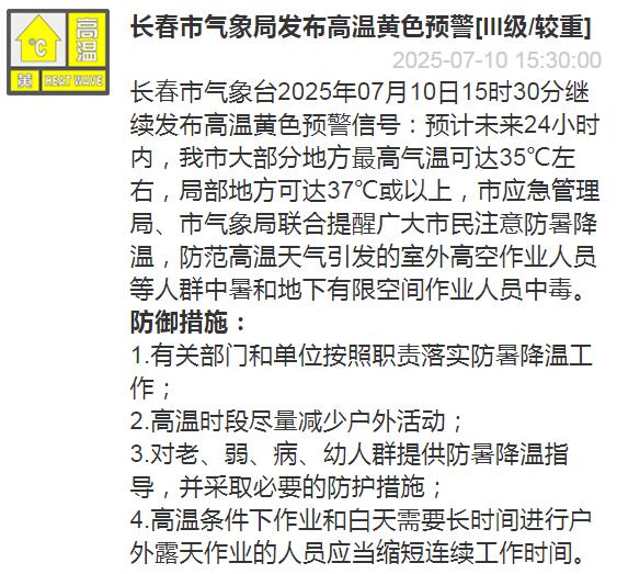 长春市气象台2025年7月10日15时30分继续发布高温黄色预警信号:预计未来24小时内,长春市大部分地方最高气温可达35℃左右,局部地方可达37℃或以上,市应急管理局、市气象局联合提醒广大市民注意防暑降温,防范高温天气引发的室外高空作业人员等人群中暑和地下有限空间作业人员中毒。