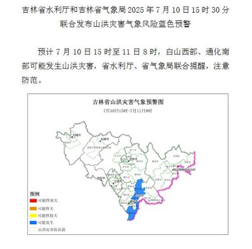 吉林省水利厅和吉林省气象局2025年7月10日15时30分联合发布山洪灾害气象风险蓝色预警:预计7月10日15时至11日8时,白山西部、通化南部可能发生山洪灾害,省水利厅、省气象局联台提醒,注意防范。