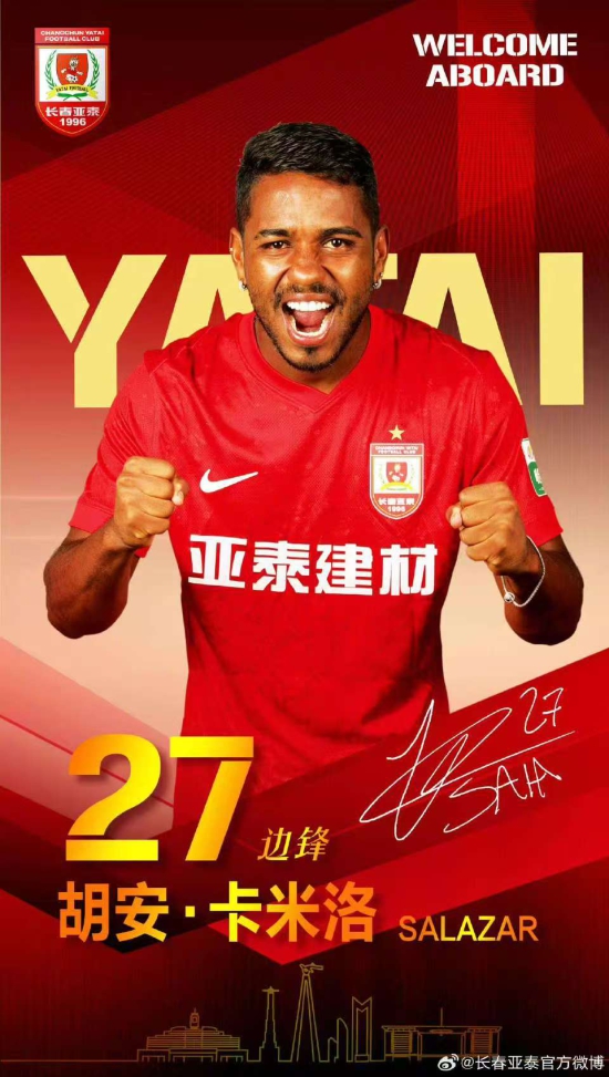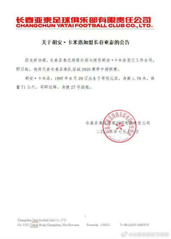 7月16日晚上,长春亚泰俱乐部官宣:哥伦布外援胡安·卡米洛正式盟球队。即日起,他将代表长春亚泰队征战2025赛季中超联赛。