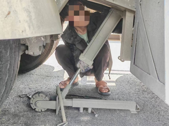 民警赶到现场时,货车孤零零停在车道内,驾驶员却“人间蒸发”。正当民警排查时,监控画面捕捉到了滑稽一幕:附近景观设施后蜷缩着一名男子,时不时探头张望,正是该车司机。原来,他看到民警出警,知道车辆超载且装了“飞机轮”(逃避计重的违规装置),情急之下钻进去想“蒙混过关”。