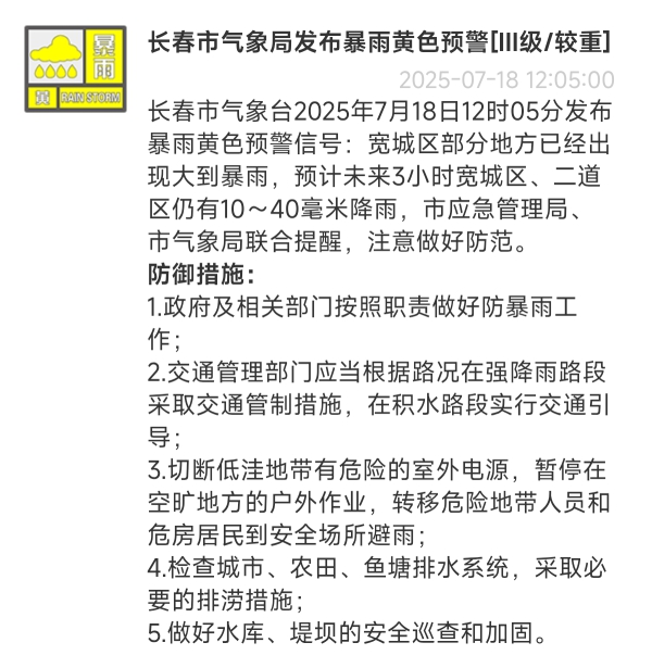 长春市气象台2025年7月18日12时05分发布暴雨黄色预警信号:宽城区部分地方已经出现大到暴雨,预计未来3小时宽城区、二道区仍有10~40毫米降雨,市应急管理局、市气象局联合提醒,注意做好防范。
