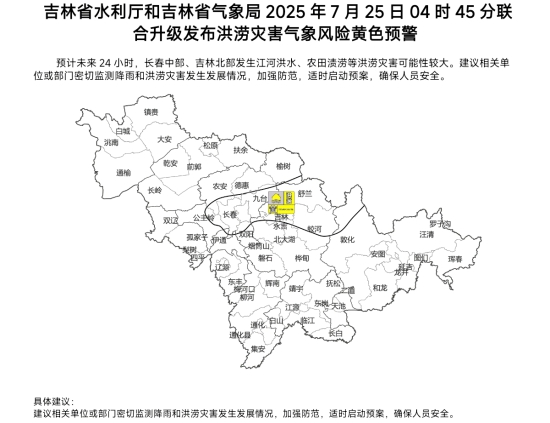 吉林省水利厅和吉林省气象局2025年7月25日04时45分联合升级发布洪涝灾害气象风险黄色预警:预计未来24小时,长春中部、吉林北部发生江河洪水、农田渍涝等洪涝灾害可能性较大。建议相关单位或部门密切监测降雨和洪涝灾害发生发展情况,加强防范,适时启动预案,确保人员安全。