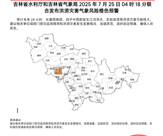 吉林省水利厅和吉林省气象局2025年7月25日04时18分联合发布洪涝灾害气象风险橙色预警:预计未来24小时,长春西南部、四平中西部发生江河洪水、农田渍涝等洪涝灾害可能性大。建议相关单位或部门密切监测降雨和洪涝灾害发生发展情况,加强防范,适时启动预案,确保人员安全。