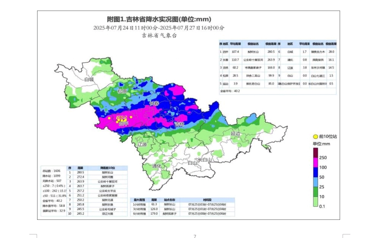 过程降水量大于200毫米的有39站,100~200毫米的有203站,50~100毫米的有269站,25~50 毫米的有140站,10~25毫米的有122站。降水量前10位:梨树长山280.5毫米、梨树河圈272.4毫米、公主岭十屋双河263.9毫米、梨树孤家子263.7毫米、公主岭太平庄257.2毫米、公主岭佟家窝棚251.2毫米、 梨树北道250.2毫米、梨树农垦 245.8毫米、公主岭毛城子245.5毫米、双辽兴隆 245.2毫米。