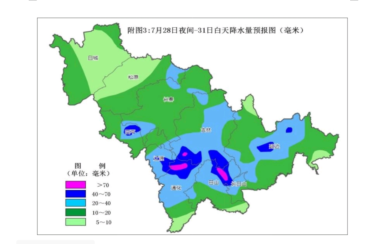 30日白天-31 日白天,长春东部、 四平东部、辽源、吉林、 通化、 白山、延边、长白山保护开发区有阵雨或雷阵雨。