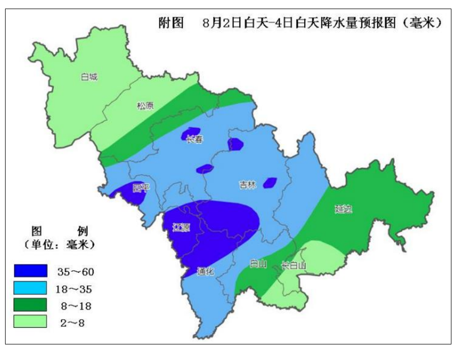 长春、四平、辽源、吉林、通化、白山西部、 延边西部有中到大雨,部分地方有暴雨, 过程降水量为18~35毫米,部分地方可达3~60毫米,个别单点可达80~110毫米, 最大小时雨强20~30毫米,个别单点小时雨强可达50毫米以上; 松原东部、白山中部、延边中北部、长白山保护开发区有小到中雨,过程降水量为8~18毫米;其他地区有阵雨或雷阵雨,过程降水量为2~ 8毫米。