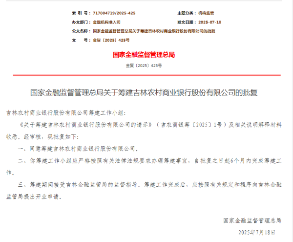近日,国家金融监督管理总局发布批复,同意筹建吉林农村商业银行股份有限公司。