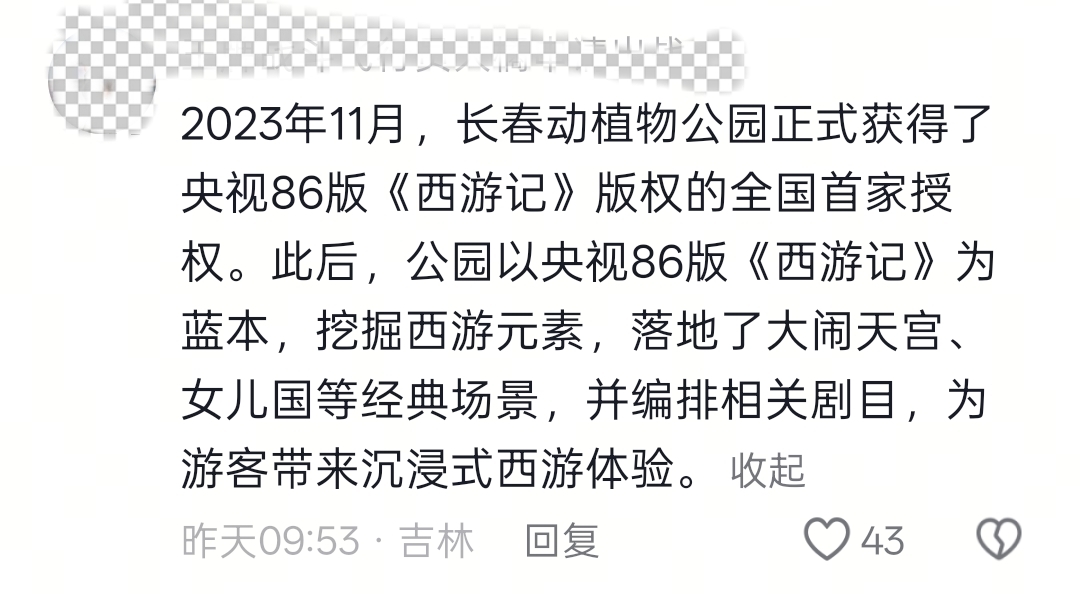 @白家大伟 在自己的自媒体平台上讲述着自己亲身感受到的长春动植物公园,在他的讲述里,许多网友得知,这个主题获央视86版《西游记》官方授权,是对经典的创新演绎。以西游角色为引,能激发孩子对动物的兴趣,实现寓教于乐,且白天科普照常,夜晚文旅融合,最大化利用园区资源。他还提到,园区动物福利切实提升,45岁白犀牛得到精心照料;主题带来的创收反哺园区,改善动物居住环境与员工待遇等等内容。