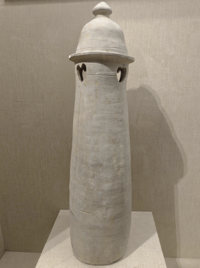 陶仓是泥质灰陶质地,通体灰白色调,轮制而成。空心圆形,上部有檐,像一定帽子,檐下有四个等距心形透孔,看起来就像两双发射爱心的眼睛。
