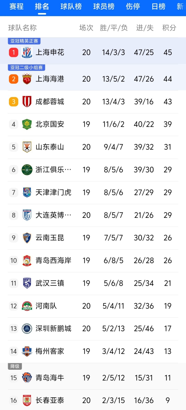 在保级关键战的另外一场比赛中,青岛海牛5比1击败云南玉昆,而梅州客家则要在明日客场挑战武汉三镇,所以,截至目前,亚泰在积分榜上依旧垫底。