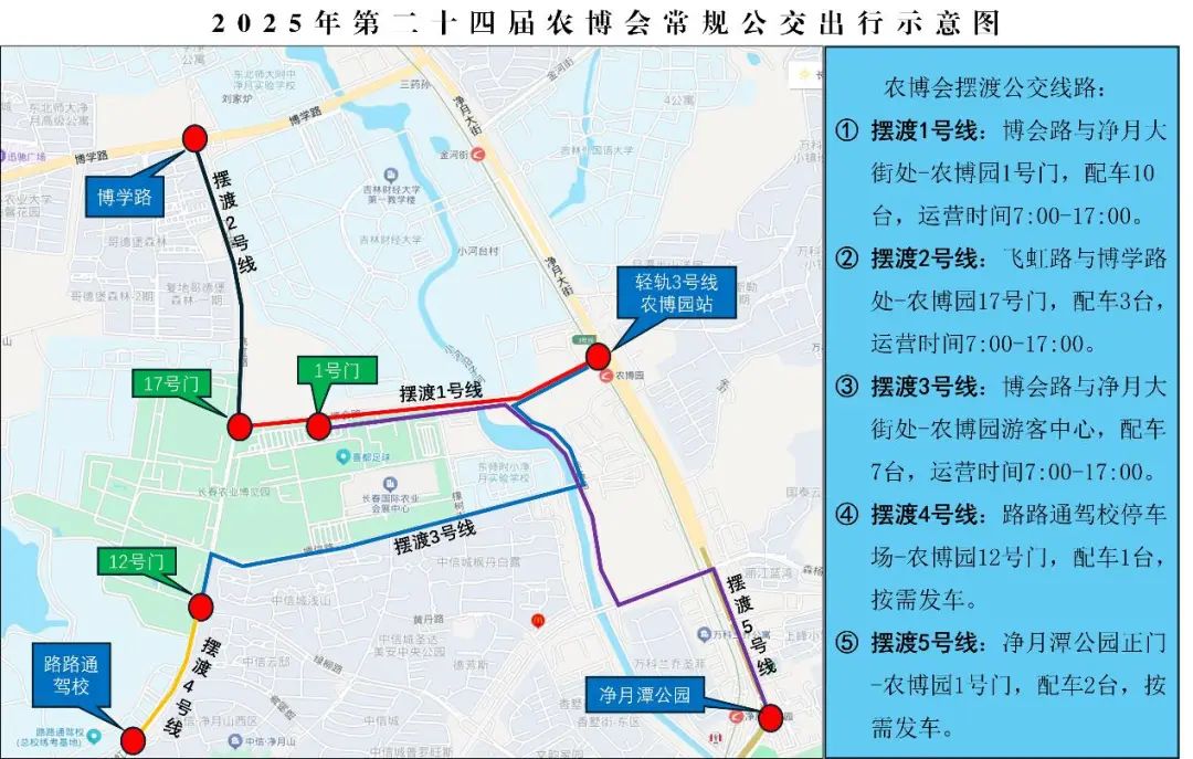 接驳5号线:上午从净月潭景区正门社会停车场发车,直达农博园1号门。下午从农博园1号门返回净月潭景区正门社会停车场。配车2台。