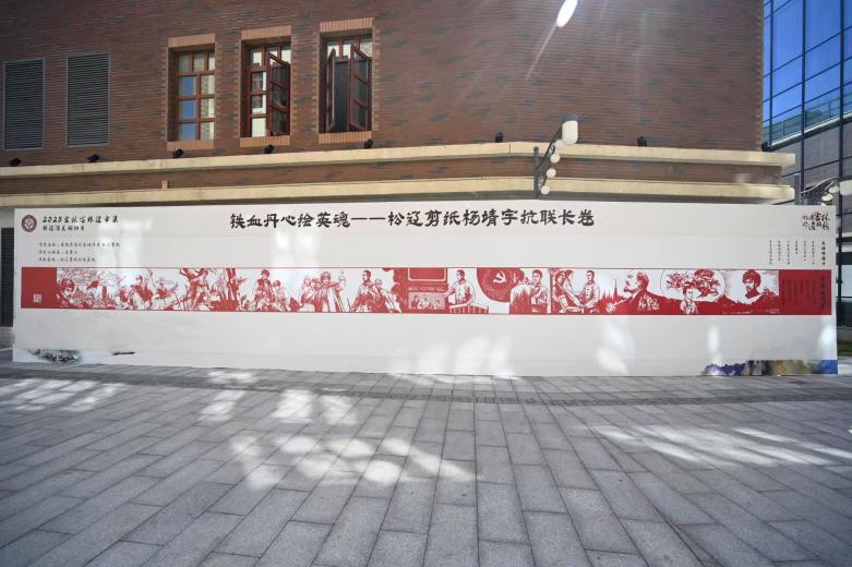 “指尖非遗”环节中,现场展出松辽剪纸《英雄杨靖宇》长卷,长卷全长近15米,无接缝,难度极高。在创作手法上,巧妙地运用了松辽剪纸独特的阳刻与阴刻相结合的技艺。阳刻线条流畅细腻,勾勒出人物的面部神情、服饰纹理等细节,使得杨靖宇及抗联战士们的形象栩栩如生;阴刻则大胆豪放,用以表现背景中的崇山峻岭、冰天雪地以及激烈的战斗场景,营造出雄浑壮阔的氛围,粗犷中见细腻,空灵中见厚重,质朴中见精致,虚幻中见真实的整体风格,实现非遗与历史的巧妙融合。