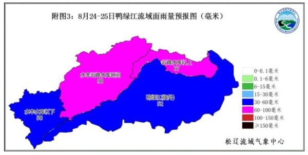 流域境外部分:集安以上过程累计雨量20~50毫米,面雨量为35毫米左右;集安以下过程累计雨量35~70毫米,面雨量为60毫米左右。