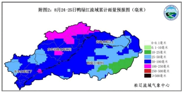 此次过程,鸭绿江流域境内和境外降水均较为明显,特别是流域的中上游。其中,境内降水主要集中在25日凌晨到傍晚, 境外降水主要集中在25日白天到夜间。