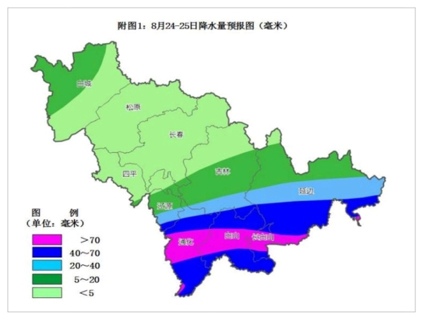 24日夜间,辽源南部、吉林东南部、 通化北部、白山北部、延边西部、长白山保护开发区有中到大雨,部分地方有暴 雨,并伴有短时强降水、雷暴大风或冰雹等强对流天气;长春 东南部、四平东南部、辽源北部、吉林中部、通化南部、白山 南部、延边东部有阵雨或雷阵雨。