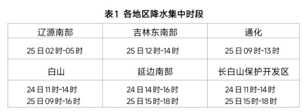 通化、白山、延边南部、长白山保护开发区有大到暴雨,部分地方有大暴雨,并伴有短时强降水、雷暴大风或冰雹等强对流天气,过程降水量40~70毫米,部分地方可达100毫米以上,个别单点雨量可达180毫米左右,最大小时雨强30~50毫米,个别单点小时雨强可达70毫米左右;辽源南部、吉林东南部、延边中部地区有中到大雨, 过程降水量20~40毫米;白城西部、辽源北部、吉林中部、延边北部有小到中雨,过程降水量5~20毫米;其他地区有分散阵雨或雷阵雨,过程降水量不足5毫米。